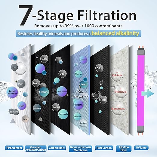 - QUALITY 7-STAGE FILTRATION: This Reverse Osmosis (RO) water filtration system removes up to 99% of over 1,000 harmful contaminants like PFAS (includes PFOA and PFOS), chlorine, fluoride, lead (removes up to 98%), arsenic, asbestos, calcium, sodium, and more.