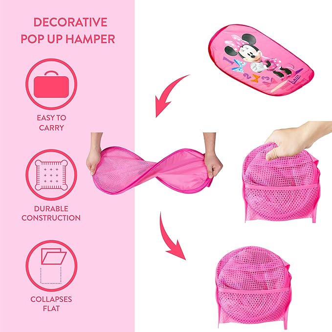 - Design: Featuring Minnie Mouse, Printed With Iconic Graphics From The Brand. Decorate Your Space With This Pop Up Hamper Featuring The Iconic Character.Designed With The Face Of Disney Star Minnie Mouse And A Pattern Of The Iconic Brand. Featuring Your Child'S Favorite Character And Will Make An Adorable Addition To A Bedroom Or Bathroom Décor.