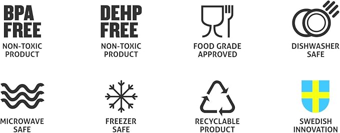 - Dishwasher safe (top rack only), microwave safe, freezer safe, BPA free, DEHP free, and food grade approved