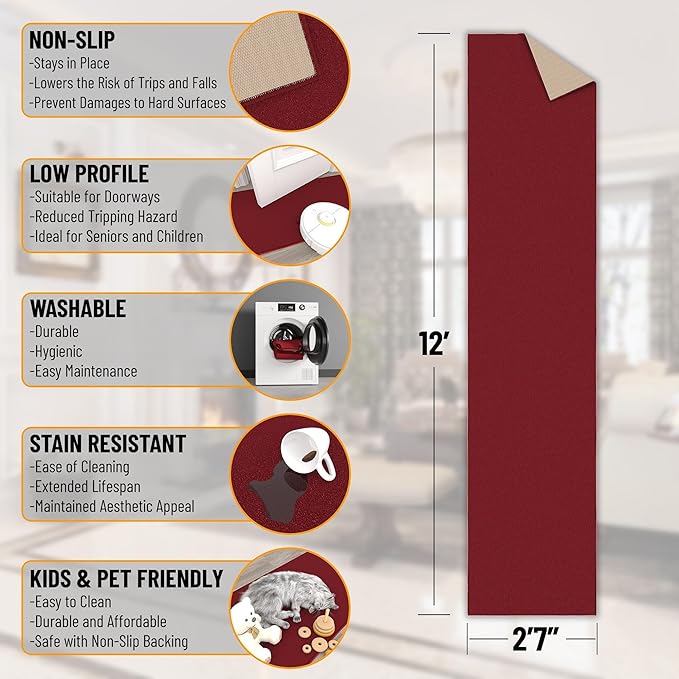 Machine Washable Modern Solid Design Non-Slip Rubberback 3x12 Traditional Runner Rug for Hallway, Kitchen, Bedroom, Living Room, 2'7" x 12', Red