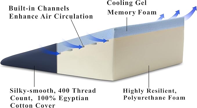 - Two Layer Design with EXTRA LARGE SIZE (33" x 30.5" x 7.5") plus an adjustable Cooling Gel memory foam headrest pillow in one package: This latest version is made of 2-INCH Cooling Gel memory foam layer on top of a firm base foam, also adding a height-adjustable Cooling Gel memory foam headrest to provide better support for your neck and head. The end result is the most comfortable wedge pillow system on the market. U.S. Patented