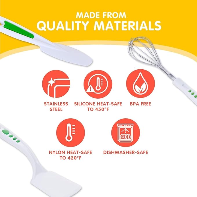- INCLUDED IN THE SET: This set is perfect for aspiring young chefs aged 4 and above. It includes a durable stainless steel whisk for effortlessly mixing ingredients, a nylon frosting spreader for smooth and even icing application, and a nylon cookie turner for easy cookie flipping. With dimensions of 2.17" L x 7.4" W x 13.78" H, these tools are designed to fit comfortably in small hands. These tools are made from heat-safe nylon up to 420°F and silicone up to 450°F.