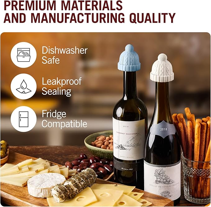 • FOR MORE THAN WINE BOTTLES! Find more uses for these reusable wine corks: bottle stoppers for alcohol (if your whiskey comes in corked bottles) and non-alcoholic drinks, champagne saver, and bottle stoppers for glass bottles generally—perhaps, bottles where you store sauces or other condiments. These are decorative wine stoppers, too: the beanie design makes the wine stoppers cute, so they will look nice in the fridge or on a shelf. Discover many ways a wine closer can be handy in the kitchen.