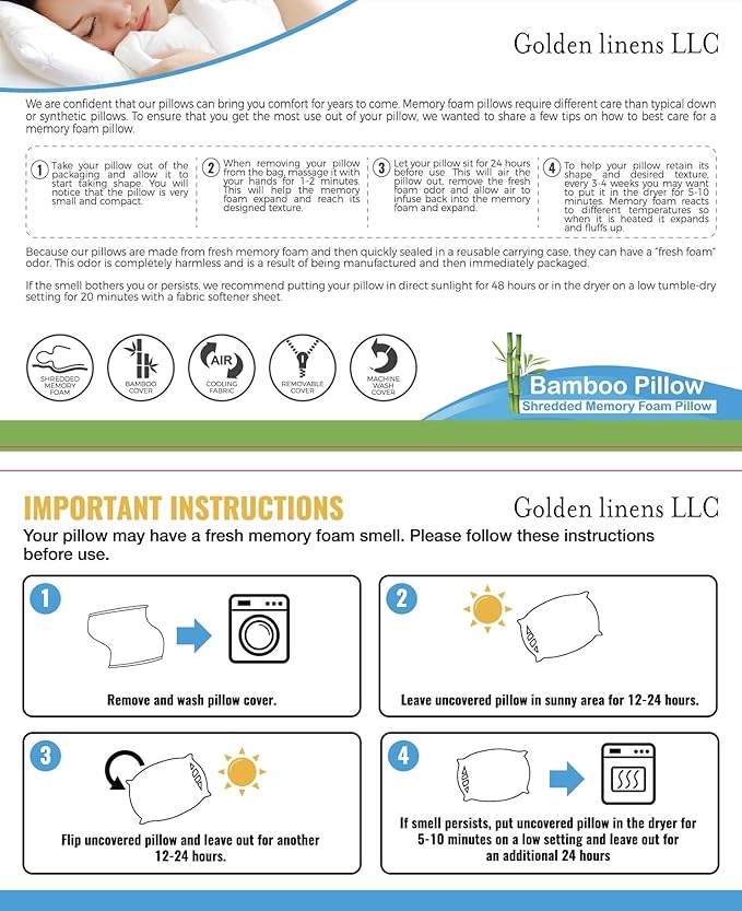 - HIGH QUALITY MATERIAL - Shredded Memory Foam: Cool memory foam filling conforms to the head and neck to relieve stress and tension. The pillow filling is made from high quality shredded memory foam. It will not become lumpy or go flat. This pillow is great for all sleeping styles including back sleepers, stomach sleepers an it promotes proper back, neck, and spine alignment.
