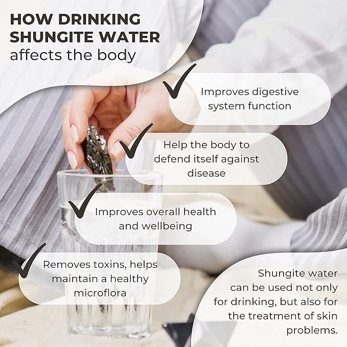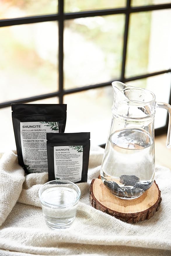 - WATER PURIFICATION KIT Adding elite shungite to water enriches it with oxygen and fills it with calcium, magnesium, and other essential mineral components. It naturally helps remove pesticides and pharmaceuticals, toxins and heavy metals. Elite shungite stones have more carbon in their composition and a higher filtration capacity, which makes them at least two times more effective than regular shungite.