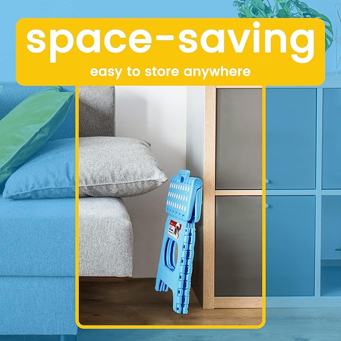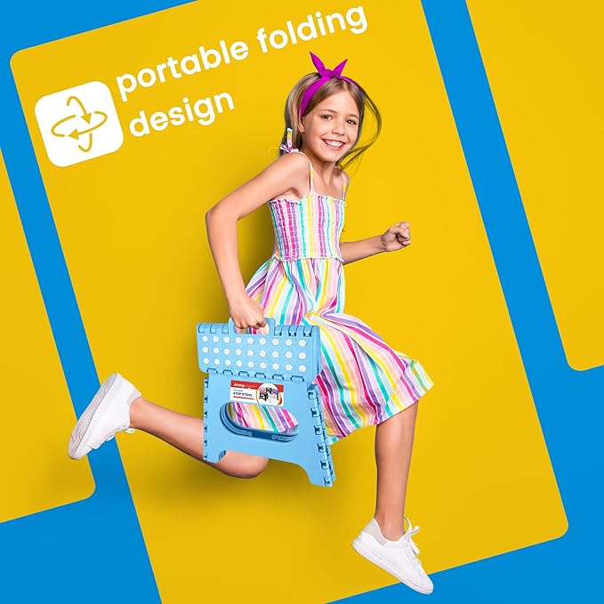 - CARRYING HANDLE AND FOLDABLE - Ergonomic carrying handle is designed for easy folding and carrying. Just lift the handle, it will fold easily and quickly in a split second with only one hand. The collapsible step stool’s handle magically appears when the stool is folded flat. Allowing you comfortably carry it around so they can place it where they need it.