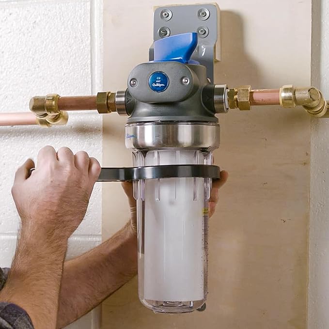 - Whole house water filtration system with 1" stainless steel reinforced inlet/outlet connectors