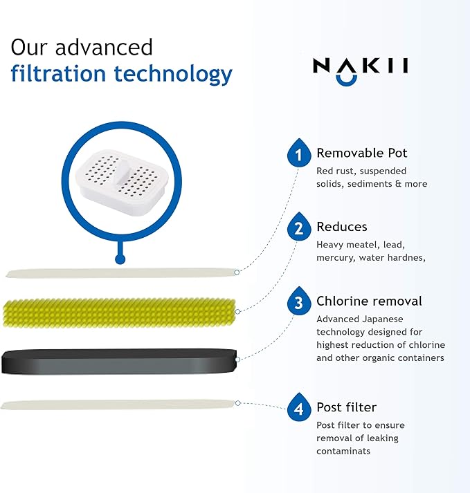 - ADVANCED FILTRATION TECHNOLOGY- HIGHEST RATE CHLORINE AND MERCURY REMOVAL! The Nakii filter is the first in the USA to use the newest innovation for water filtration, using Activated Carbon Fiber (ACF) which isn't used in Brita filters or other brands, ACF features 98% of Chlorine, Mercury removal TO IMPROVE DRASTICALLY THE HEALTHINESS, Taste and odor, the highest rate in the market to reduce, lead, rust, sediment and suspended particles, eliminates unpleasant color and lime-scale.
