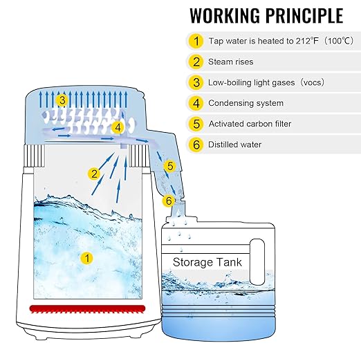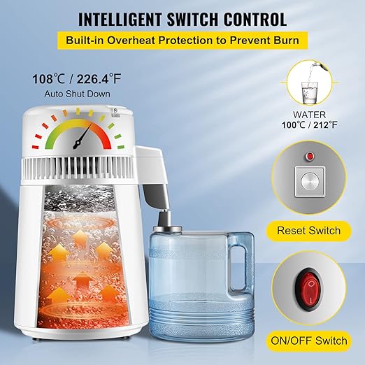 - 【Home & Commerical Use】VEOVR upgraded home water distiller provides free carbon packs and citric acid for cleaning sediment and limescale. ideal for distilling water, alcohol, and so on. Perfect for labs, hospitals, dental clinics, offices, home use