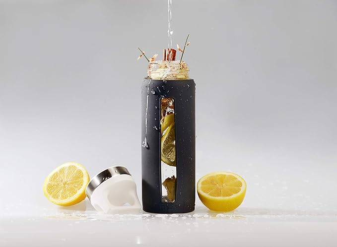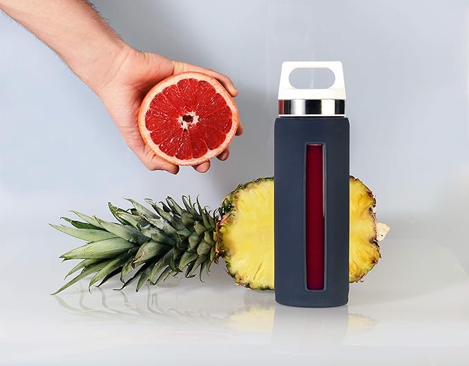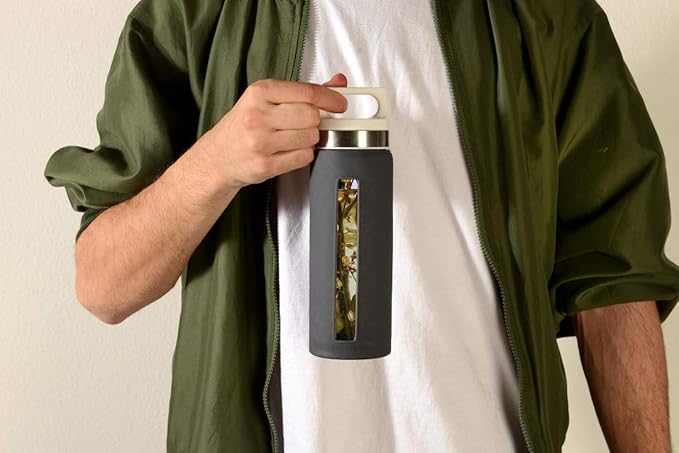 - RESISTANT & DISHWASHER SAFE: This grey water bottle is made out of high-grade broscilate glass. Its silicon cover offers a nice grip and protection in the event of slipping away. Extremely durable, heat resistant and dishwasher safe.