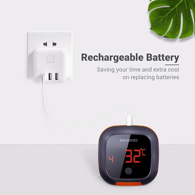 - 【Let You Free When Grilling】Inkbird 2 probes grill thermometer can pair with Android or iPhone (Please make sure the GPS location is open). This bbq thermometer read your cooking temperature by your phone anywhere (Connecting distance range up to 150ft/50M). High temperature accuracy could let you be rest for your cooking. No need worry about your meal overdone with this Wireless Grill Thermometer. Please note: Tearing off the plastic protect film on the screen before using.