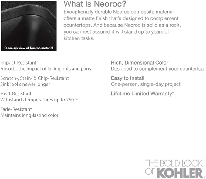 - KOHLER Neoroc composite is durable and built to withstand day-to-day cleaning tasks