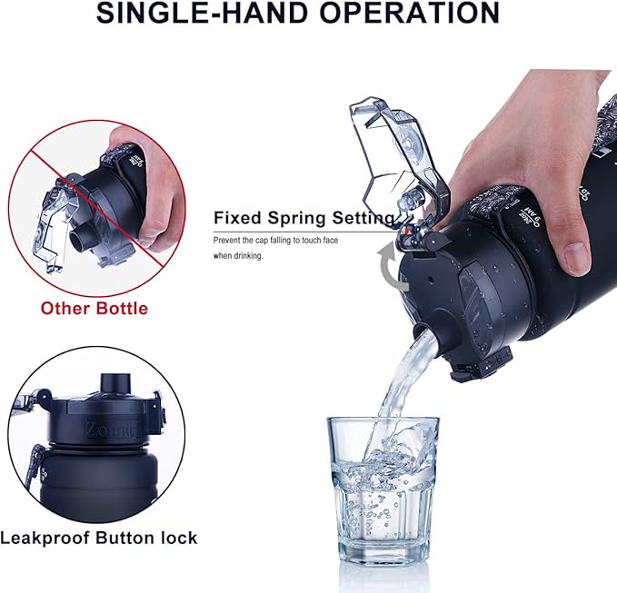 - ➤【DURABLE & ONE-HAND OPERATION】ZOUNICH sports water bottles are durable while retaining a light weight. Its patented design features a quick thumb button release and locking system. Improved hidden metal spring which prevents the water bottle lid from making contact with your face while drinking. This makes the sports bottle ideal for cycling, climbing, hiking, running.
