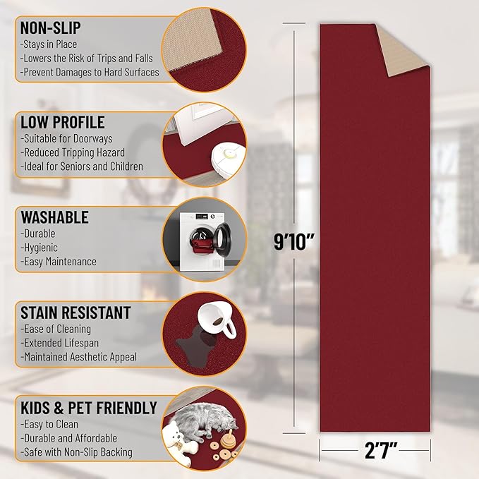 Machine Washable Modern Solid Design Non-Slip Rubberback 3x10 Traditional Runner Rug for Hallway, Kitchen, Bedroom, Living Room, 2'7" x 9'10", Red