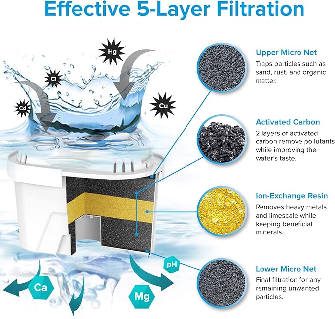 - EFFECTIVE 5-LAYER FILTRATION: Upper Micro Net, Activated Carbon (2 layers), Ion-Exchange Resin, and Lower Micro Net remove chlorine heavy metals (such as lead, cadmium, mercury, copper, aluminum), pesticides, odors, and suspended particles.