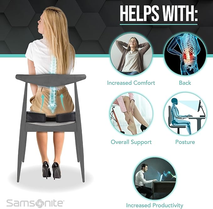 - HIGH-GRADE MEMORY FOAM - This seat cushion from Samsonite is stuffed with the best memory foam on the market. This foam reacts immediately to the precise shapes and curvatures of your body to offer lower back and upper leg support customized just for you. It remembers the shape of your body, so you can rely on it to adjust right back to the perfect form for you the moment you start using it.
