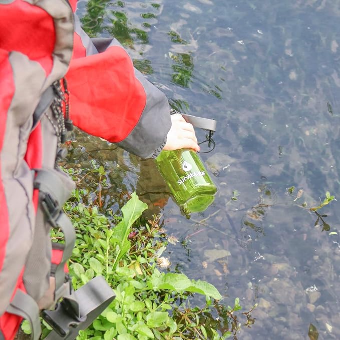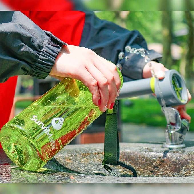 - 4-Stage Filtration - The Survimate water filter bottle adopts a composite filter technology, can reduce most contaminants. The filter element uses a coarse filter screen, a 0.01μm hollow fiber UF membrane, a sediment PP membrane and an activated carbon fiber to reduce chlorine, bad odor and intercept heavy metals, sediment, soil, organic matter and other impurities, etc.