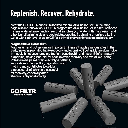 - REPLENISH, RECOVER, REHYDRATE - GOFILTR Magnesium Alkaline Infuser is a well balanced mineral water alkalizer and ionizer that enriches your water with magnesium, electrolytes and other beneficial minerals, creating fresh mineral ionized alkaline water with a pH level of up to 9.5 for optimal everyday hydration and recovery.