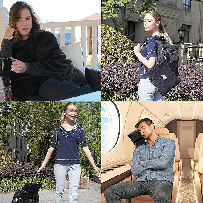 - Special Feature : Travel pillow blanket: Use it as a blanket or a pillow on planes, in RV, in cars, on trains, along with the travel case., Plane Blanket Travel - The outdoor blanket is large and has a sleek, matching travel bag with a hand luggage belt., Airplane Travel Accessories - Travel must haves for airplane as it weighs less than 1lb, so you can just easily carry it around for long flights., Micro Plush Blanket - The black travel blanket features a unique patented design that keeps you warm and comfortable in all seasons., Travel Bag - This airline blanket is an easy-to-fold travel blanket and fits into our portable zipper pouch Travel pillow blanket: Use it as a blanket or a pillow on planes, in RV, in cars, on trains, along with the travel case., Plane Blanket Travel - The outdoor blanket is large and h… See more