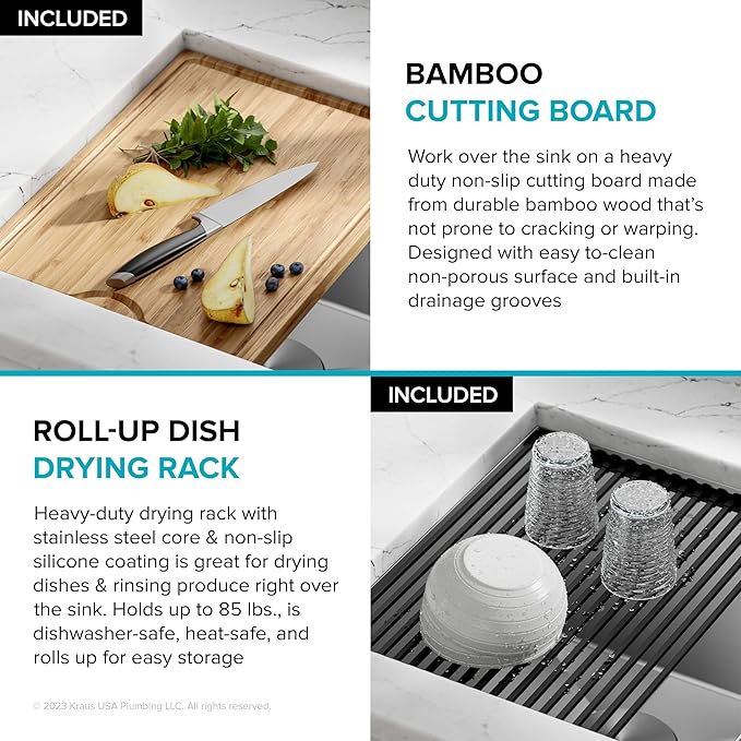 - WORKSTATION SINK with integrated ledge for sliding accessories allows you to work right over the sink while minimizing clutter on the kitchen counter – Chop and slice on the durable bamboo cutting board or dry dishes on the heavy-duty rolling mat