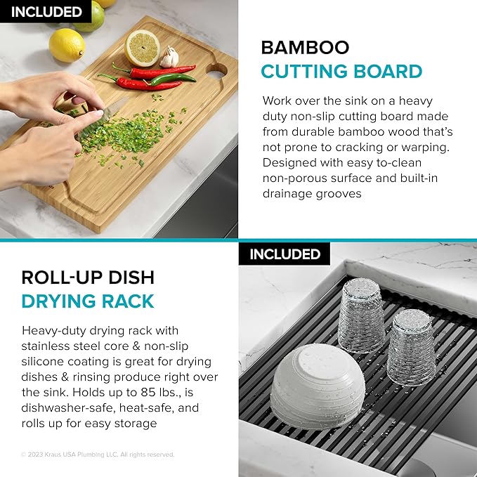 • WORKSTATION SINK with integrated ledge allows you to slide custom accessories across the sink to streamline meal prep and cleanup without losing space on the kitchen counter – 5-PIECE CHEF’S KIT INCLUDES: ROLL-UP DISH DRYING RACK perfect for rinsing produce, drying dishes, and protecting countertops from hot items; BAMBOO CUTTING BOARD won’t crack or warp; DISH GRID, STRAINER and DRAIN COVER