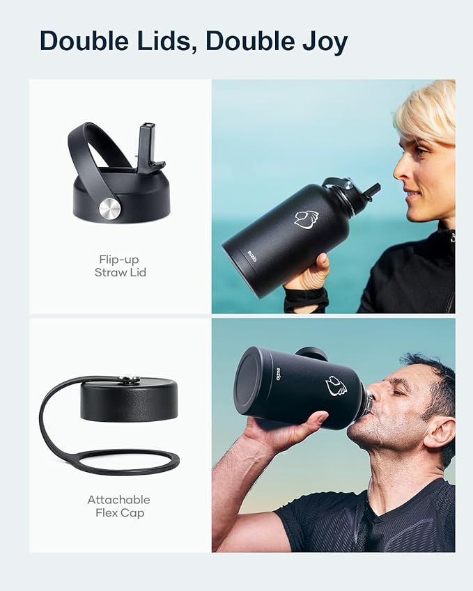 - 2 Caps Pack: This 64 oz stainless steel water bottle comes with straw lid and flex cap, the flex cap is perfect for the beach, camping and hiking, while the straw lid is suitable for cycling and road trip