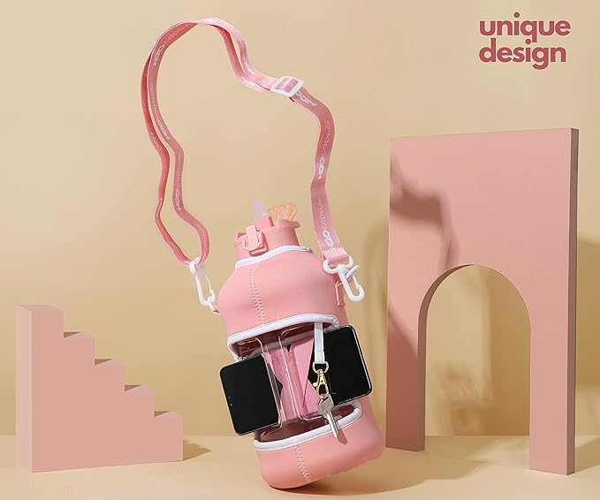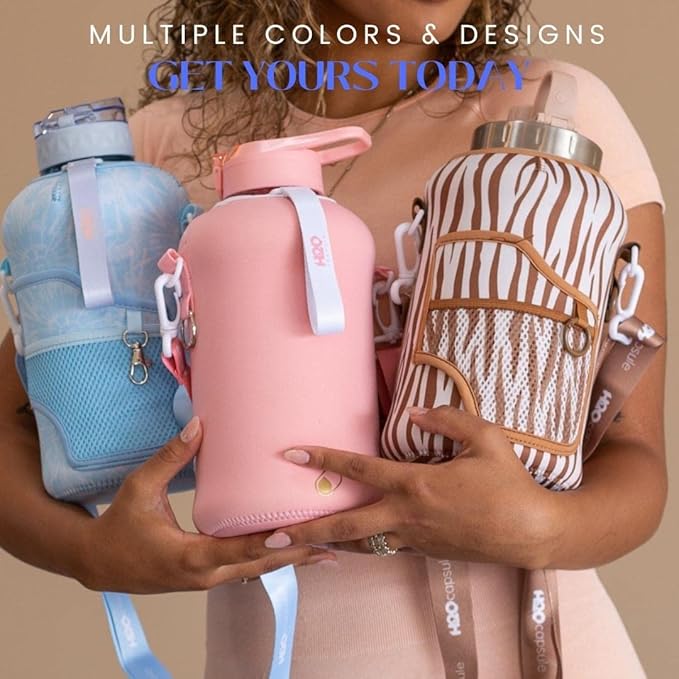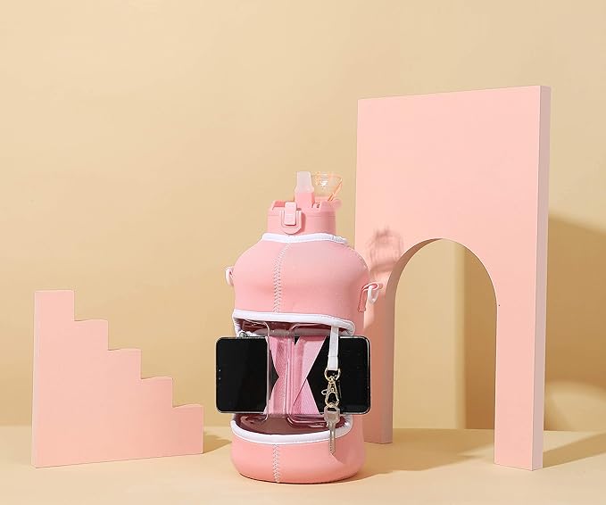 - UNIQUE STORAGE SLEEVE: Using the space under the large jug handle to store your stuff, the patent-pending removable thermal sleeve has a unique design that holds your cards and cell phone, and is finished with an in-built key chain and removable shoulder strap for convenient hands free carrying! It’s the only encased water jug that holds your things while you exercise.