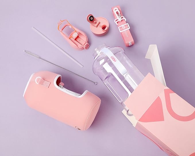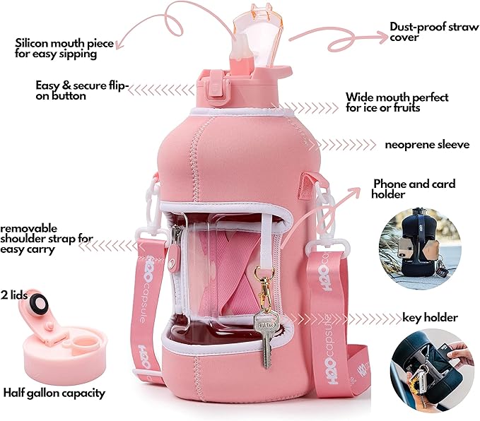 - HALF GALLON HYDRATION WITH COVERED STRAW LID: The extra large 2.2L / 74 oz plastic jug holds all the water you need to stay hydrated while you exercise. The reusable half gallon comes with a leak-proof & dust-proof covered straw lid, which helps protect the mouthpiece and flips open with a click of a button. The straw-lid is air-sealed: Run straw brush through mouth piece before initial use. The H2O Capsule bottle with storage sleeve comes with a bonus straw cleaning brush.