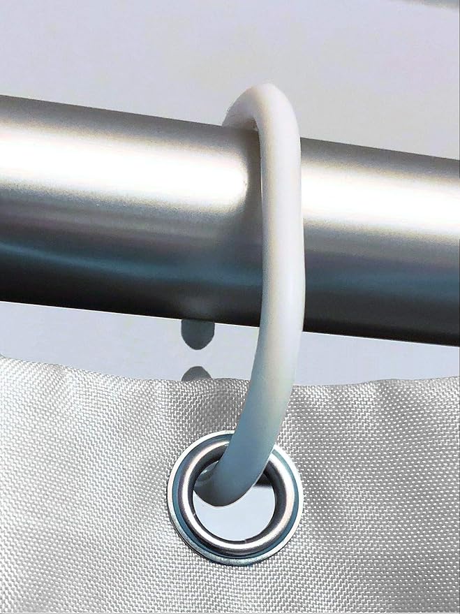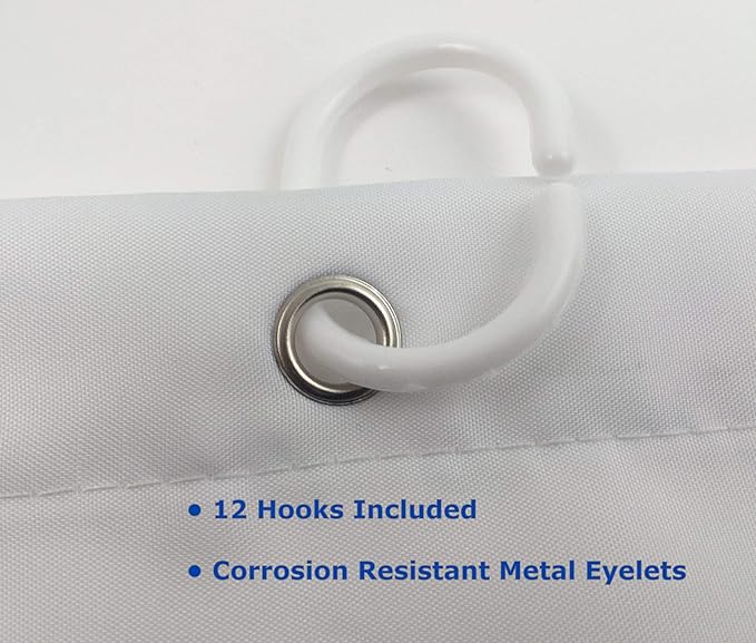- INCLUDED: Set of 12 plastic hooks and a weighted bottom hem. Hooks are easily installed into corrosion resistant metal eyelets/grommets. Weighted bottom hem keeps shower curtain stabilized.