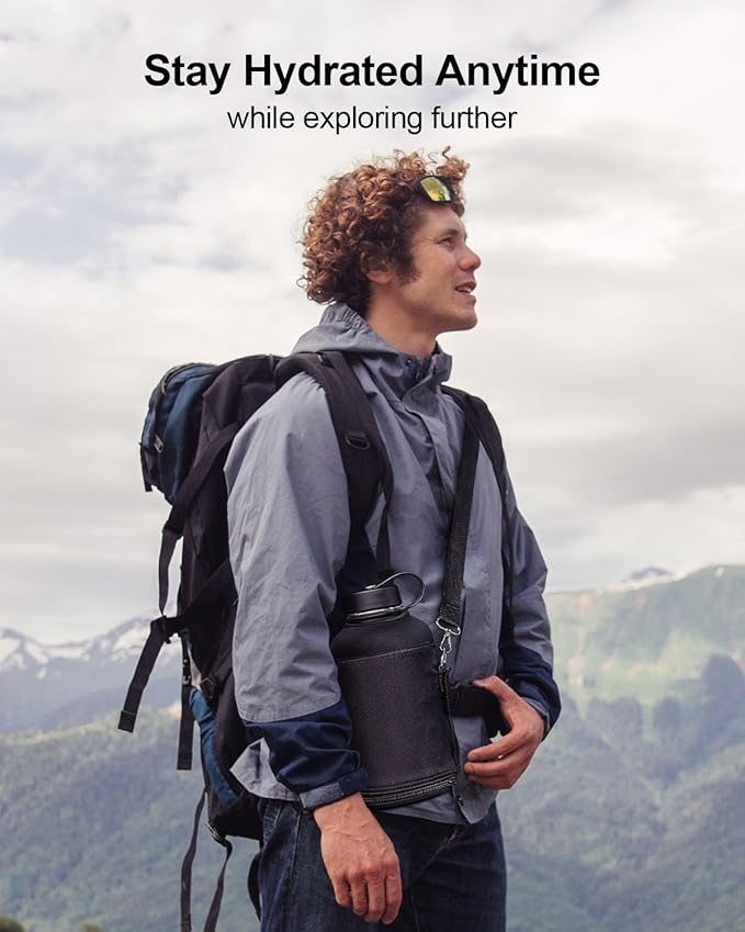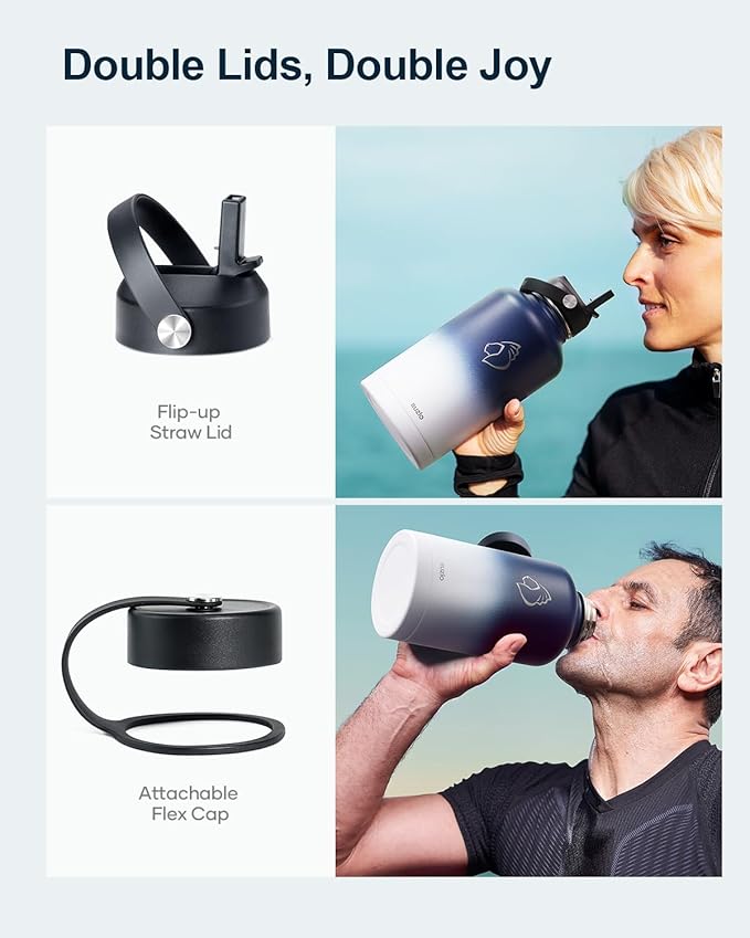 - 2 Caps Pack: This 64 oz stainless steel water bottle comes with straw lid and flex cap, the flex cap is perfect for the beach, camping and hiking, while the straw lid is suitable for cycling and road trip