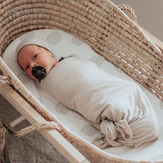 - This convenient two-pack features a modern and playful grey polka dot design paired with a grey dotted circle set on white, combed jersey knit cotton. You can be rest assured that your baby’s sleep surface will always be covered with a clean, trendy, and soft cotton sheet with this bassinet sheet set!
