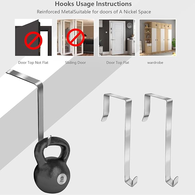 - 【EASY ASSEMBLY】- Over door pantry organizer can be hung on the doors by 2 heavy duty metal hooks(hooks include) fitting over the two most popular door widths between 1 3/8" to 1 2/3", also hanging wall mounted by nails.