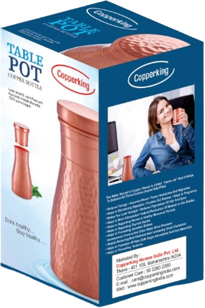 Pure Copper Hammered Pitcher with Inbuilt Tumbler | Ayurvedic Solid Copper Water Bottle Drinking Jar with Cup Galss | Best Use Carafe for Office, Bedroom, Dining Table Pot 37oz / 1100 ML / 1.1 Liter