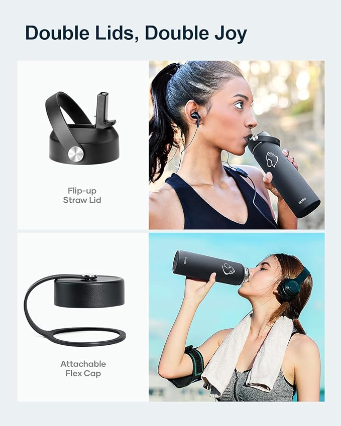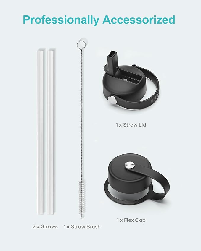 - What You Get: Included with a BUZIO insulated water bottle, a straw lid (2 straws), a flex cap, and a cleaning brush. If for any reason, you are not 100% satisfied with product, we will offer a full refund or an exchange!
