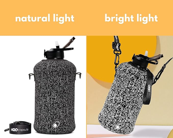 - HALF GALLON HYDRATION WITH COVERED STRAW LID: The extra large 2.2L / 74 oz plastic jug holds all the water you need to stay hydrated while you exercise. The reusable half gallon comes with a leak-proof & dust-proof covered straw lid, which helps protect the mouthpiece and flips open with a click of a button. The straw-lid is air-sealed: Run straw brush through mouth piece before initial use. The H2O Capsule bottle with storage sleeve comes with a bonus straw cleaning brush.