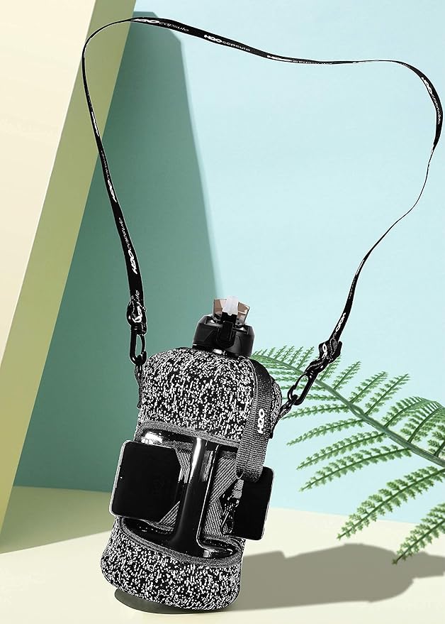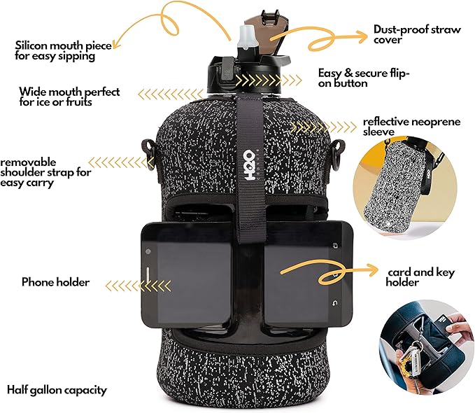 - UNIQUE STORAGE SLEEVE: Using the space under the large jug handle to store your stuff, the patent-pending removable thermal sleeve has a unique design that holds your cards and cell phone, and is finished with an in-built key chain and removable shoulder strap for convenient hands free carrying! It’s the only encased water jug that holds your things while you exercise.