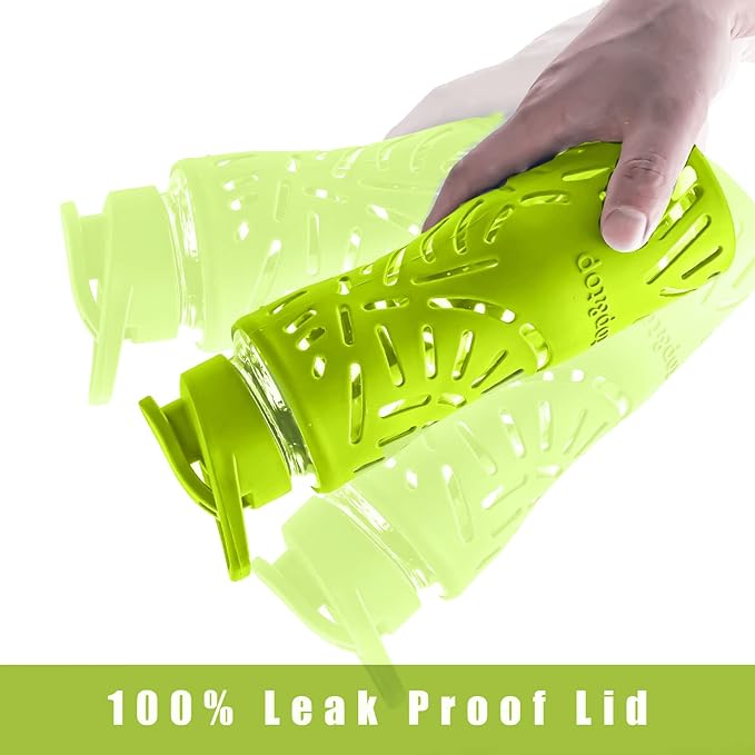 - 3 SMART SIPPING LEAK-PROOF LIDS – Each water glass bottle comes with a set of 3 different lids: Straw spout, Flip Sport Cap and Carry Loop. Each screw-on cap close tight for a leak proof seal, making this a great bottle to pack in your lunch bag or gym bag.