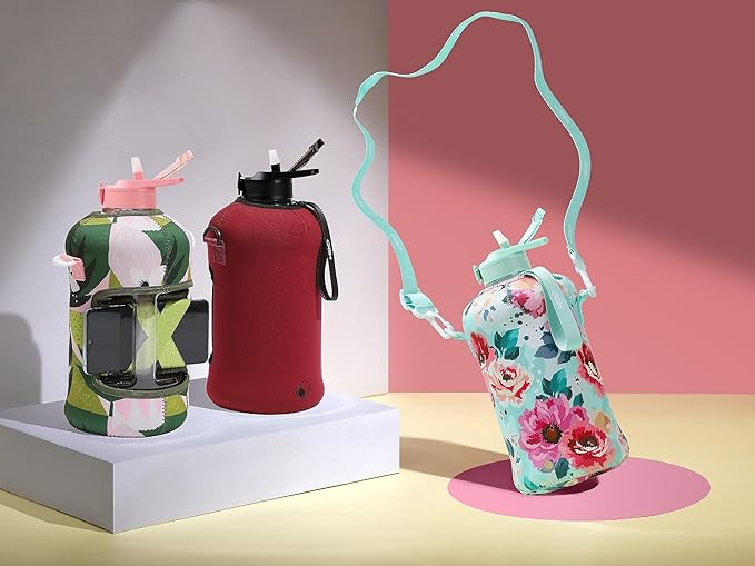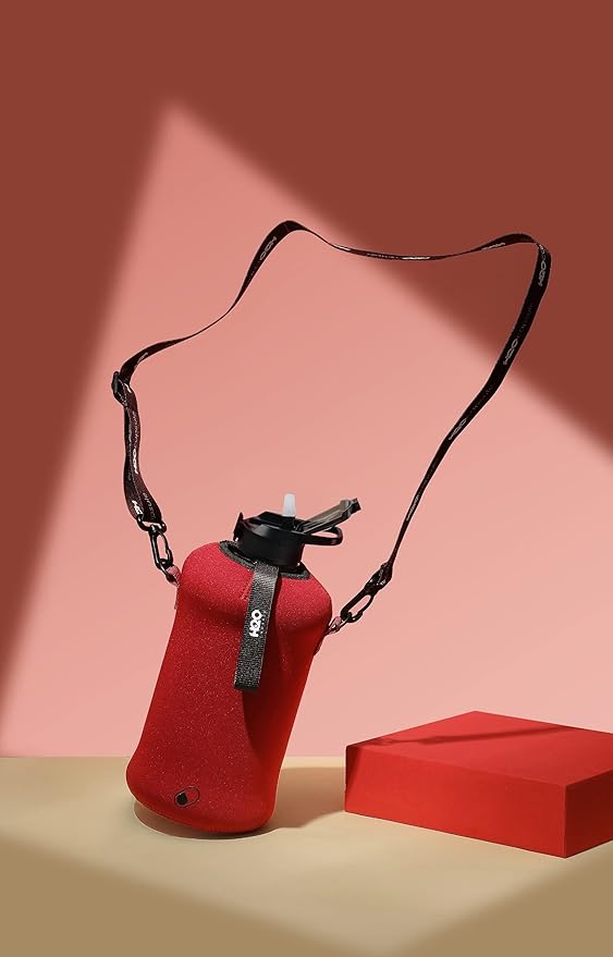 - UNIQUE STORAGE SLEEVE: Using the space under the large jug handle to store your stuff, the patent-pending removable thermal sleeve has a unique design that holds your cards and cell phone, and is finished with an in-built key chain and removable shoulder strap for convenient hands free carrying! It’s the only encased water jug that holds your things while you exercise.