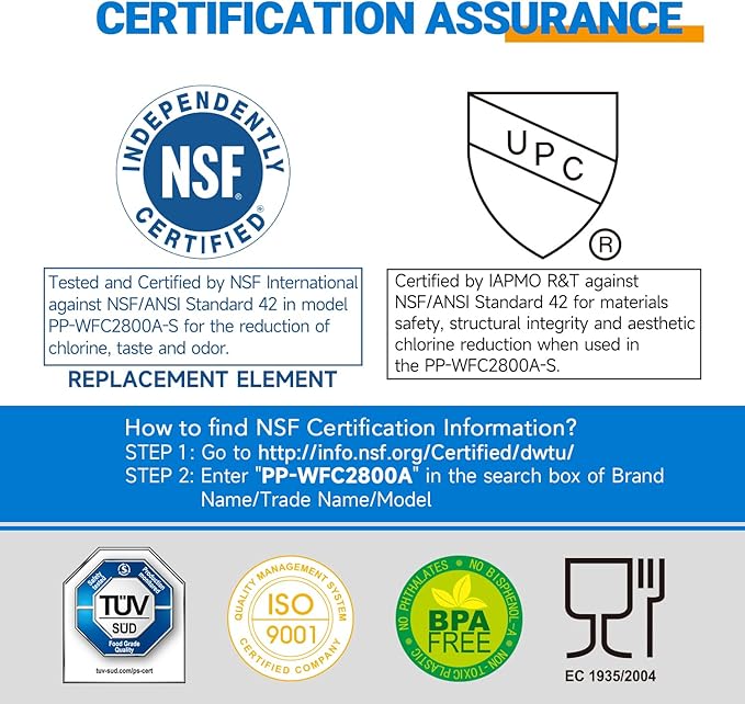 - ❄️Authoritative Certifications -The filter is certified by NSF/ANSI 42 for reducing chlorine, taste, and odor, and NSF/ANSI/CAN 372 for lead-free compliance. It removes 99% of chlorine, odor and improves water taste significantly. It also certified by European TUV, ROHS, REACH, Canadian CSA, BPA Free and Australian Water Mark. Only select products with authoritative certifications for your households.