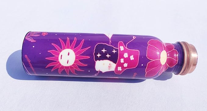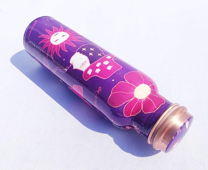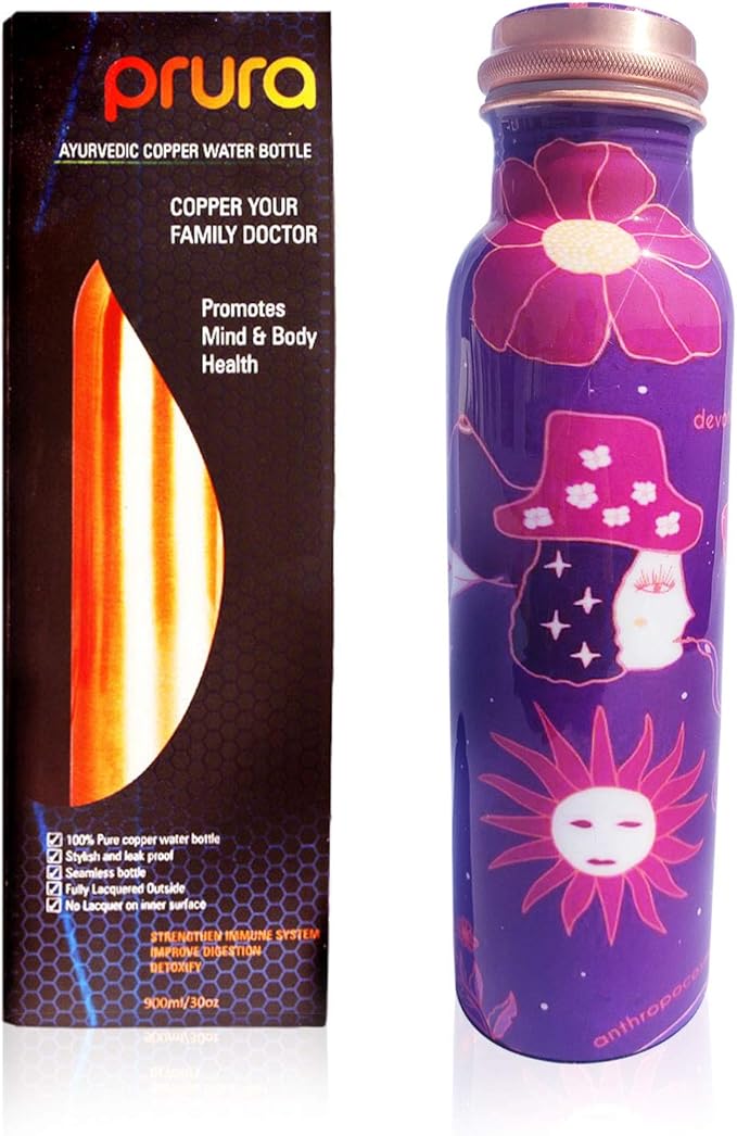Pure Printed Copper Water Bottle - Leak Proof Ayurvedic Drinkware Copper Vessel for Sports, Gym, Outdoors, Yoga, Health Benefits (30 oz)