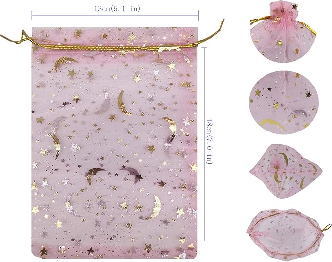 100pcs Organza Bags Moon and Stars Baby Shower Favor Bags Jewelry Candy Gift Card Bags With Gold Line Drawstring Pouches (Pink, 5x7)