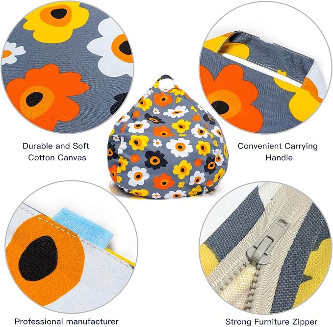 YuppieLife Kids Storage Bean Bag Cover(No Filling)Toy Organizer|Carrying Handle Sofa|Available for Kids and Teenager|Cuddle Chair|Machine Washable and Durable(27“,Grey Flora)