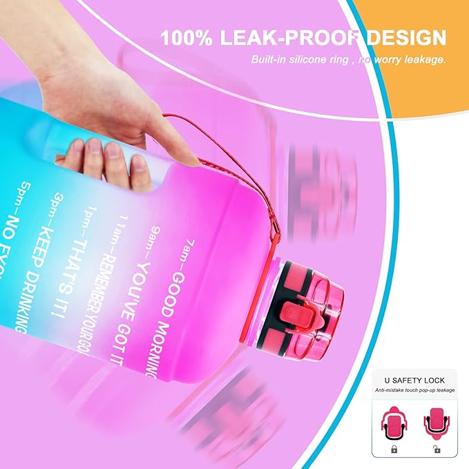 - 【MOTIVATIONAL WATER BOTTLE】It high quality drink reminder water bottle with convenient hourly time markers to help you boost your daily water intake. Warmly Notice:this bottle is plastic and big, easy to squeeze and dent in the shipping. If it was damaged accidentally when you receive, please contact us immediately.