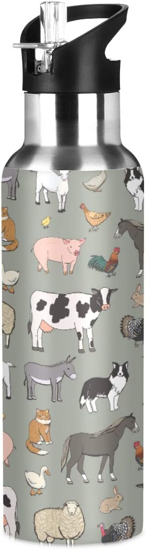Farm Animals Pattern Stainless Steel Water Bottle with Straw, BPA Free Reusable Leakproof Water Jug for Fitness Camping Outdoor Sports