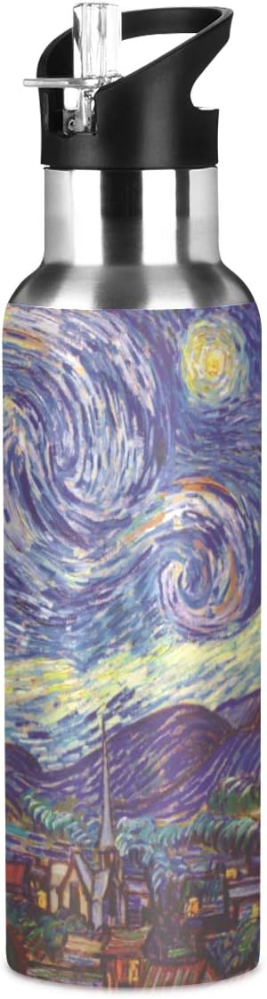 Van Gogh The Starry Night Sports Water Bottle, 22 Oz BPA Free Non-Toxic Stainless Steel Water Bottle with Straw for Gym Yoga Fitness Camping