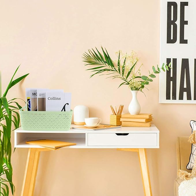 3 Pack Plastic Storage Baskets, Portable Green Fish Scale Pattern Hollow Desktop Storage Bin Box with Handle for Kitchen, Bathroom, Kids Room or Nursery Storage – 13.8 x 11.2 x 5.1 inches