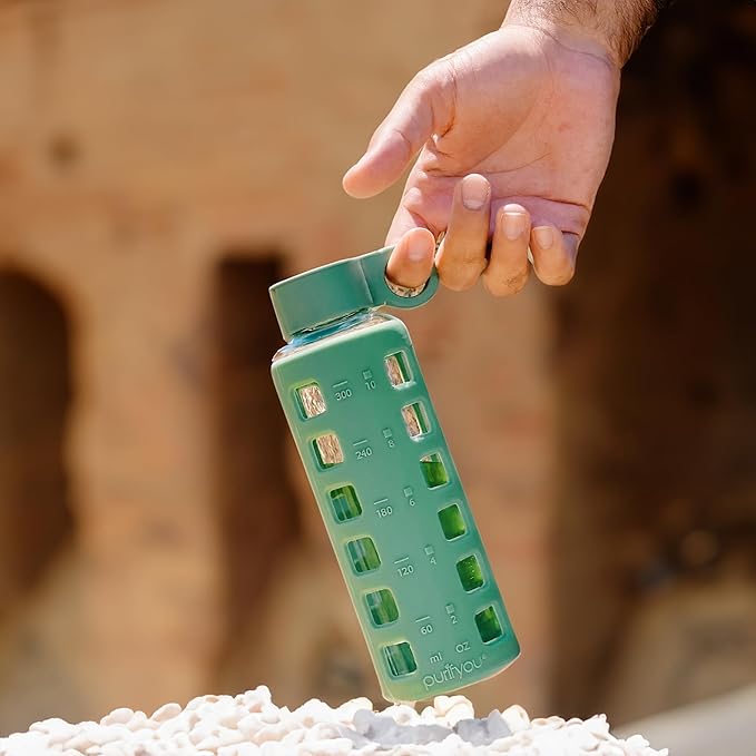 purifyou Premium 40/32 / 22/12 oz Glass Water Bottles with Volume & Times to Drink, Silicone Sleeve & Stainless Steel Lid Insert, Reusable Bottle for Fridge Water, Milk, Juice (12oz Shale Green)