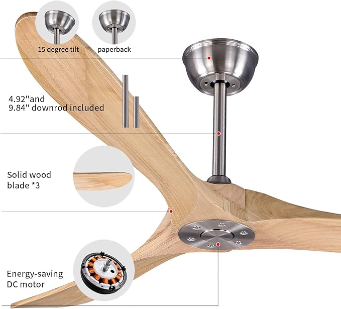 Bigzone 60" Outdoor Ceiling Fan With Remote Control, DC Motor Energy Saving, 3 Solid Wood Blades, Wood Ceiling Fan No Light, Brushed Nickel Ceiling Fan With Reversible Blades