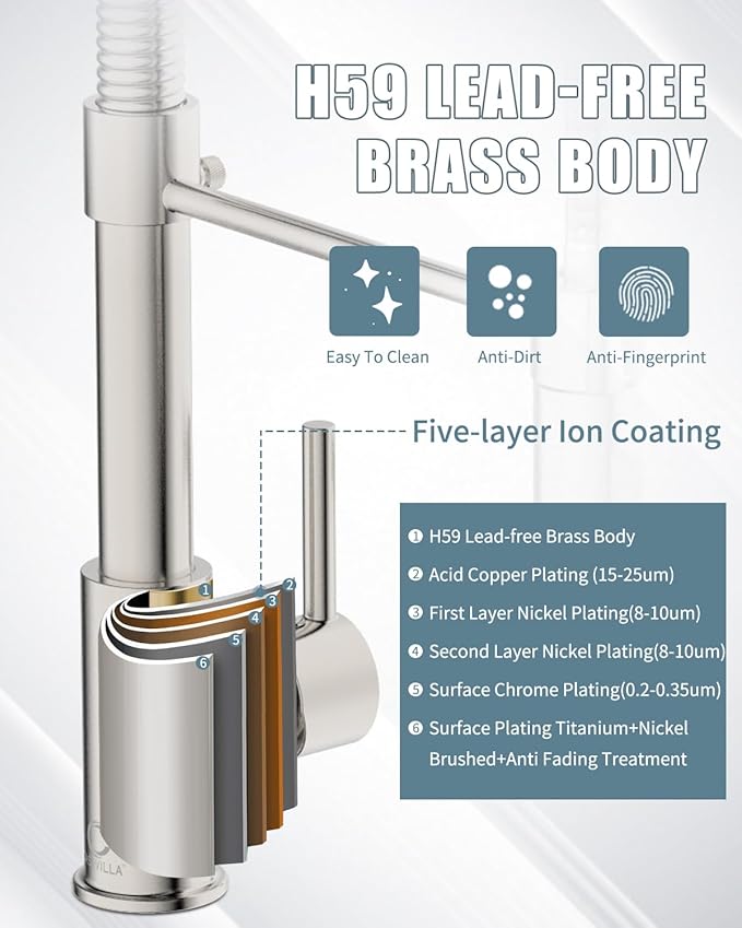 • 【EASY MAINTENANCE】Lead-free solid brass body and commercial SUS 304 stainless steel spring construction forged products. Brushed Nickel surface treatment added 18/8 Chromium/Nickel content provides a superior anti-corrosion and anti-rust finish that prevents dirt such as fingerprints or water stains from adhering to the faucet surface, making the kitchen look cleaner. Daily cleaning with a cloth or water is enough, less time cleaning and more time having fun with your family.
