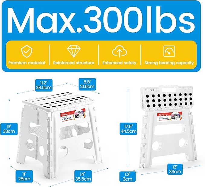 - ✔【PREMIUM QUALITY 】- The maximum load capacity of the folding step is 300 pounds, which is mainly used for indoor sitting. when we need to stand on it and reach up a high place, folding stools can carry a safe weight of more than 75 pounds.